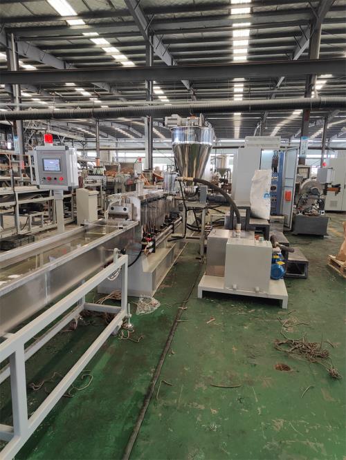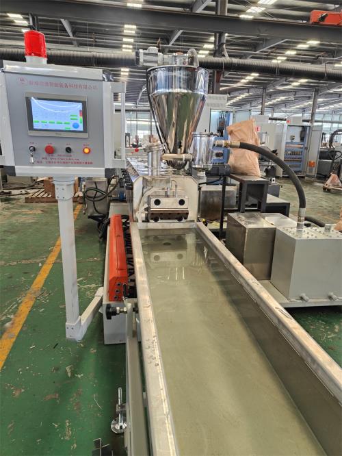 捏合螺塊以及反旋螺塊;螺桿組件串聯(lián)式排列組合;2)芯軸:采用高韌性、高抗彎、高強(qiáng)度的優(yōu)質(zhì)合金鋼40CrNiMoA,調(diào)質(zhì)硬度HB300-350;螺紋元件與芯軸為漸開線聯(lián)接;強(qiáng)度高,承載負(fù)荷大,拆裝組合方便; 3)螺紋元件材質(zhì)為優(yōu)質(zhì)高速工具鋼6542,高溫真空淬火熱處理;整體硬度:HRC60-64;螺桿元件通過(guò)加工中心制作,由曲面成型磨加工;5、料筒1)材質(zhì):45#鋼為基體,∞內(nèi)孔采用優(yōu)質(zhì)雙合金襯套;共十二節(jié),L=290mm/節(jié),第一節(jié)筒體為進(jìn)料筒體,第六為自然排氣;第十節(jié)筒體為抽真空;其余筒體為閉口筒體,筒體采用軟水冷卻;2)加熱區(qū)段:進(jìn)料區(qū)不加熱,其他采用優(yōu)質(zhì)鑄鋁加熱器。雙螺桿造粒機(jī)6、水冷卻系統(tǒng)1)水泵泵電機(jī)功率:3kw;自動(dòng)控水電磁閥;手動(dòng)閥用銅閘閥控制;加大水流量,2)采用環(huán)保風(fēng)冷卻系統(tǒng)(環(huán)保型:發(fā)明專利號(hào):CN201911312134.6)不需要接外循環(huán)水冷卻,不用徘外水;采用閉環(huán)循環(huán)系統(tǒng) 7.水循環(huán)真空泵,1)水循環(huán)真空泵電機(jī)功率:2.2KW,真空泵采用環(huán)保冷卻系統(tǒng)(環(huán)保型:發(fā)明專利號(hào):CN201911312115.3)不需要接外循環(huán)水冷卻,采用閉環(huán)循環(huán)系統(tǒng),8、液壓板式換網(wǎng):1)換網(wǎng)器,板式過(guò)濾自動(dòng)換網(wǎng)器,流量截面為圓形;2)液壓缸、液壓站等一套,采用YA-N46抗磨46#液壓油;(油品需客戶自行采購(gòu))9、機(jī)頭裝置:1) 熱電偶與壓力傳感器分開安裝,分別用于檢測(cè)溫度和壓力